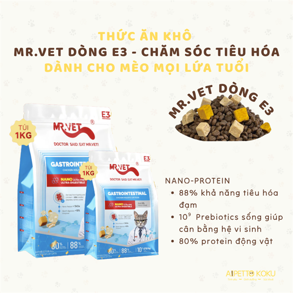 Hạt Mr. Vet E3 chăm sóc hệ tiêu hoá dành cho mèo mọi lứa tuổi 1kg